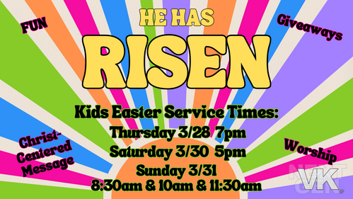 For every service, we provide a safe and fun place for your kids to learn about Jesus. Our kids' services are always energetic, fun and taught by a committed TEAM and kids staff. From infant through 5th grade your kids will learn how Jesus loves them. Our purpose is to lead kids to a new victory in Jesus.